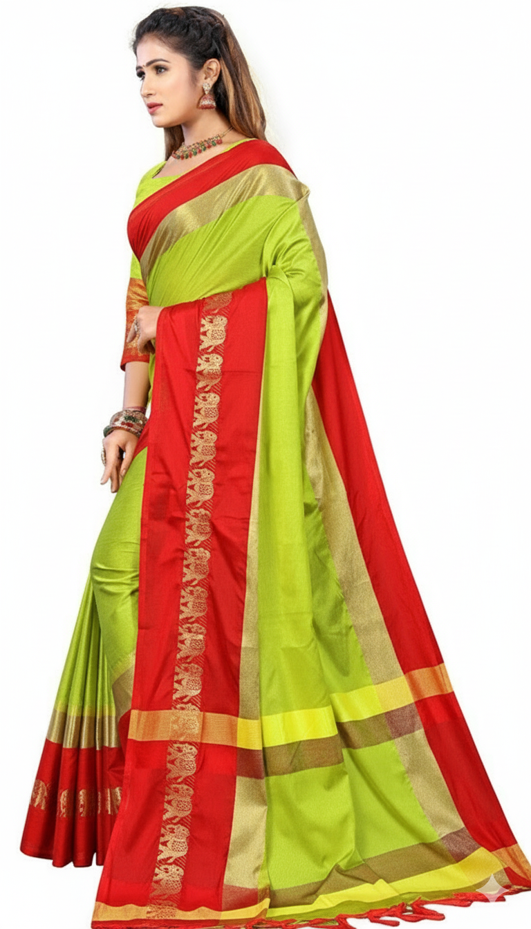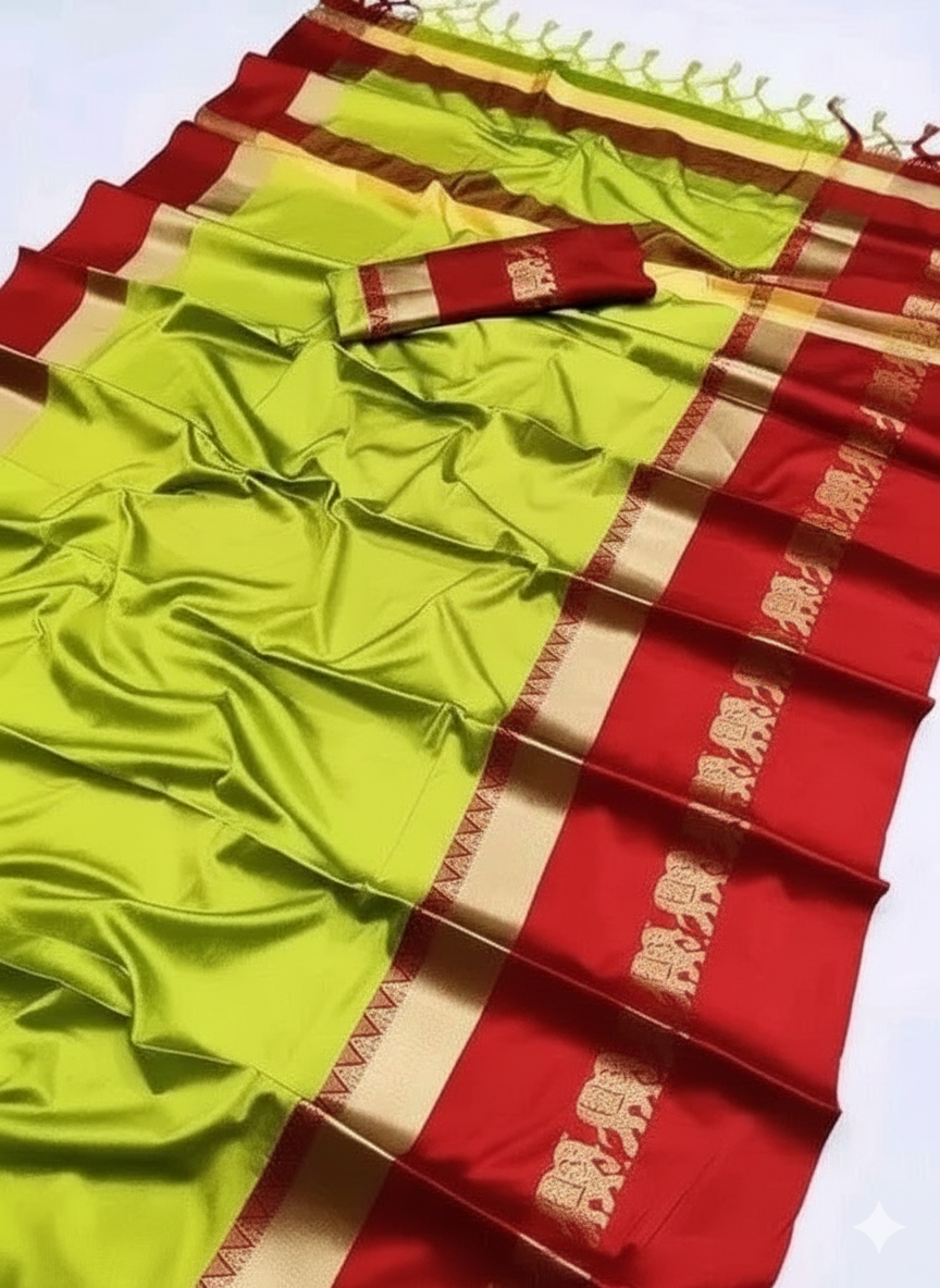 Lemon & Red  Soft Cotton Silk Auspicious Gaja Motif Saree For Women