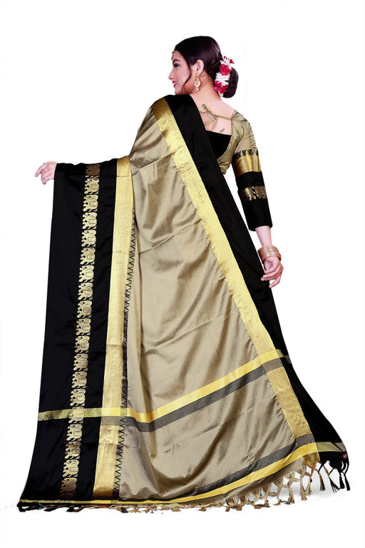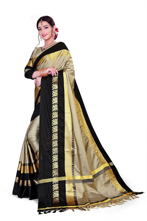 Chiku & Black  Soft Cotton Silk Royal Procession Drape Saree For Women