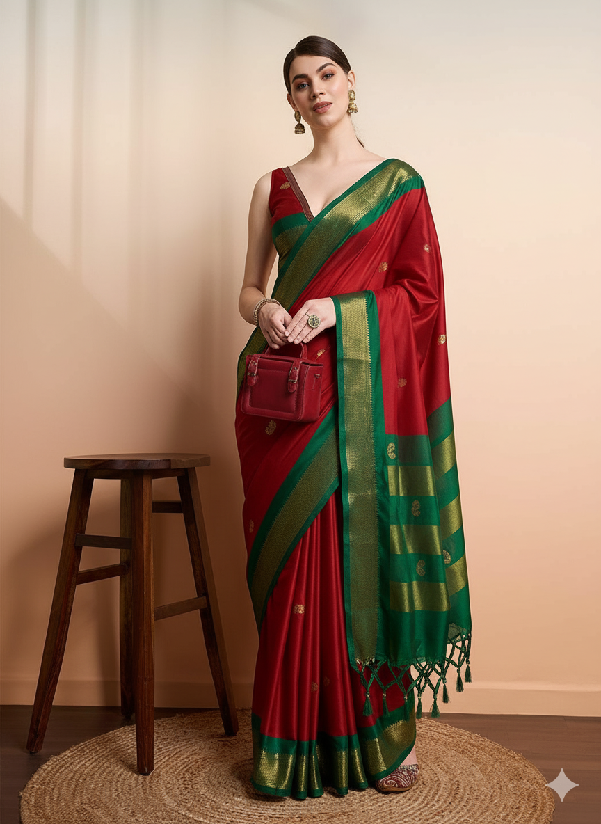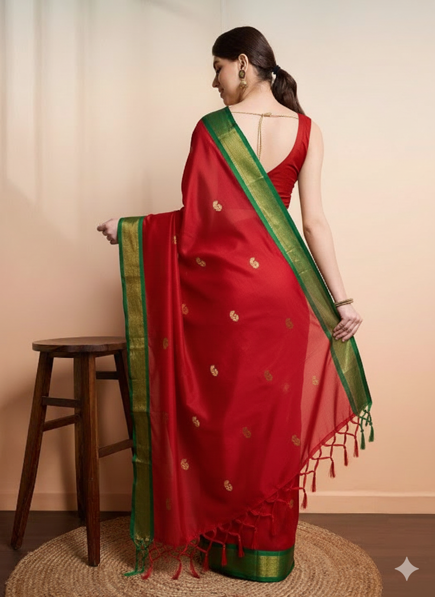 Red Green Soft Cotton Silk Crimson Meadow Glow Saree For Women