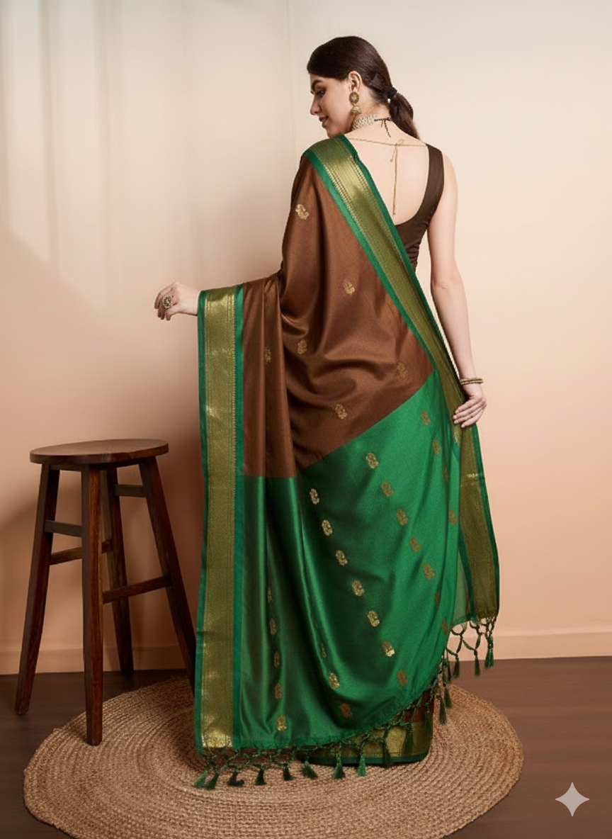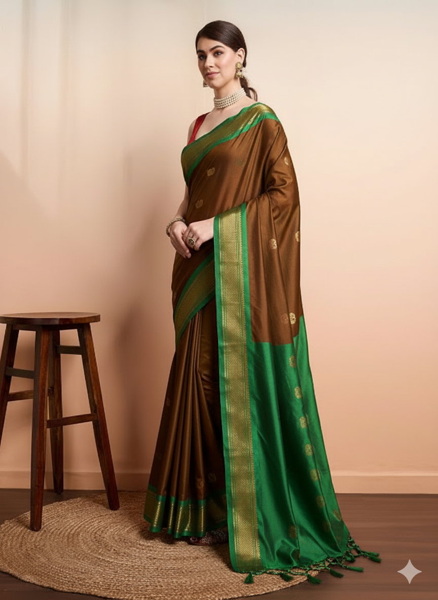 Brown Green Soft Cotton Silk Olive Meadow Essence Saree For Women