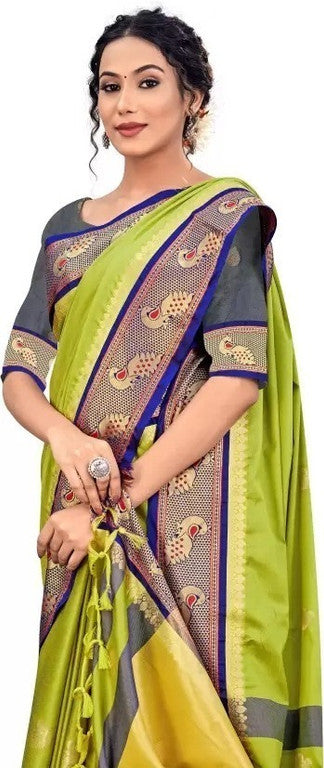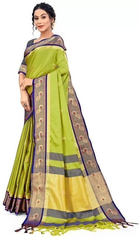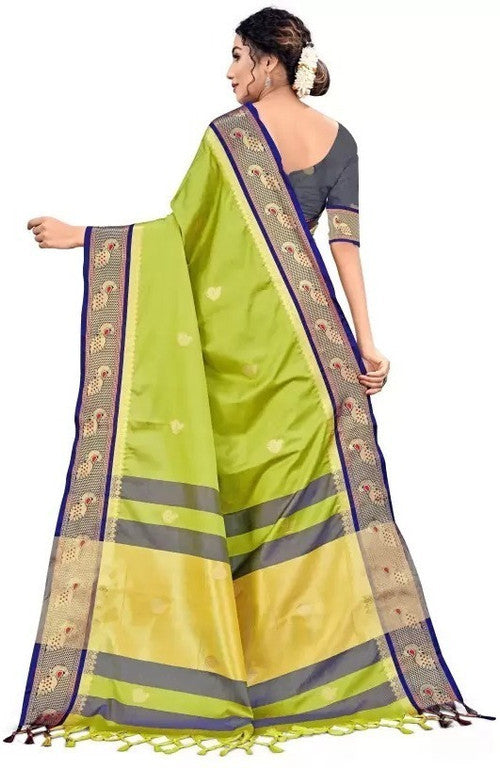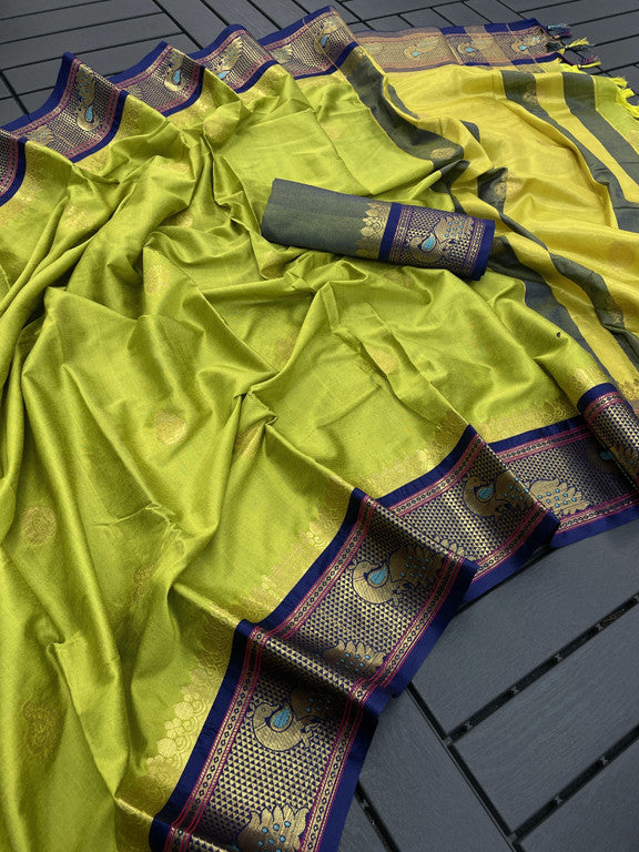 Lemon Green & Navy Blue Soft Cotton Silk Ocean Spark Saree For Women