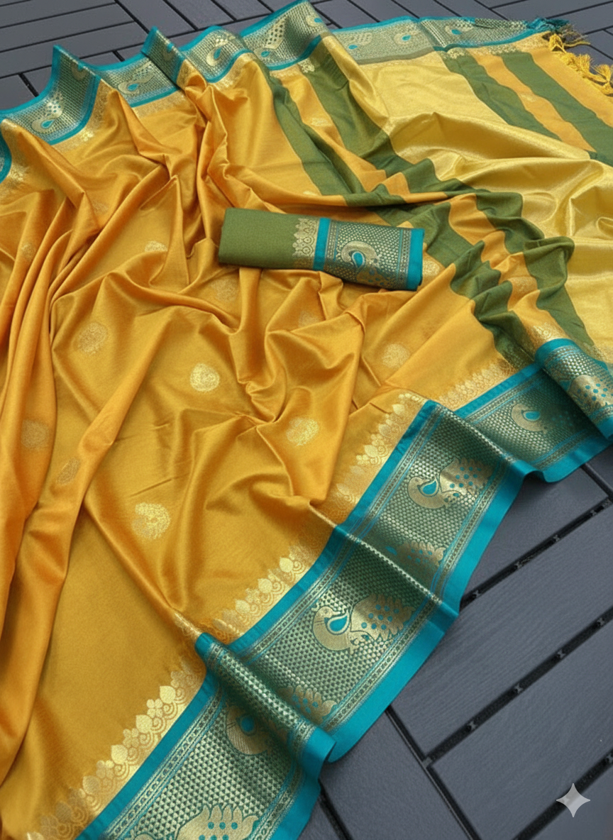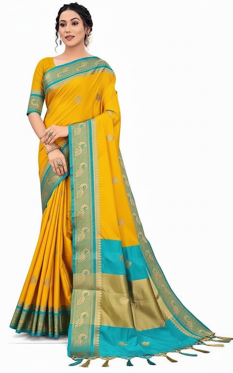 Golden Cyan Soft Cotton Silk Bloom Saree For Women
