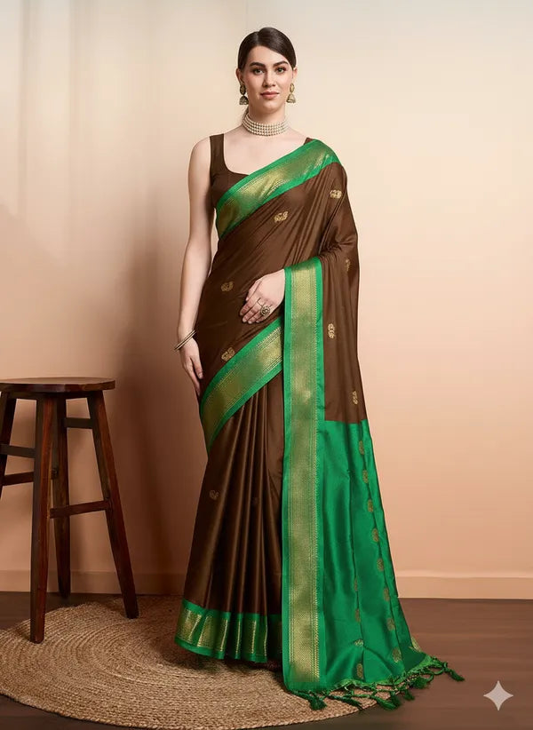Brown Green Soft Cotton Silk Olive Meadow Essence Saree For Women